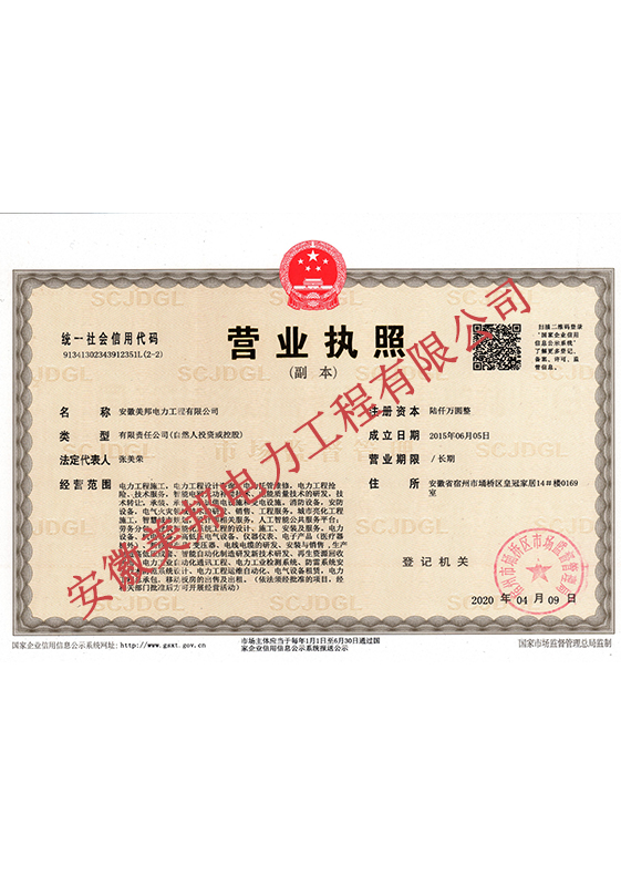 安徽美邦電力工程有限公司成立于2015年6月,坐落于宿州高新區。是一家從事電力工程設計、電力設備生產、電力工程施工、電力托管服務、電力工程搶險為一體的一站式綜合性公司。公司現有各類專業技術職稱的管理人員及大批從事電力工程專業施…